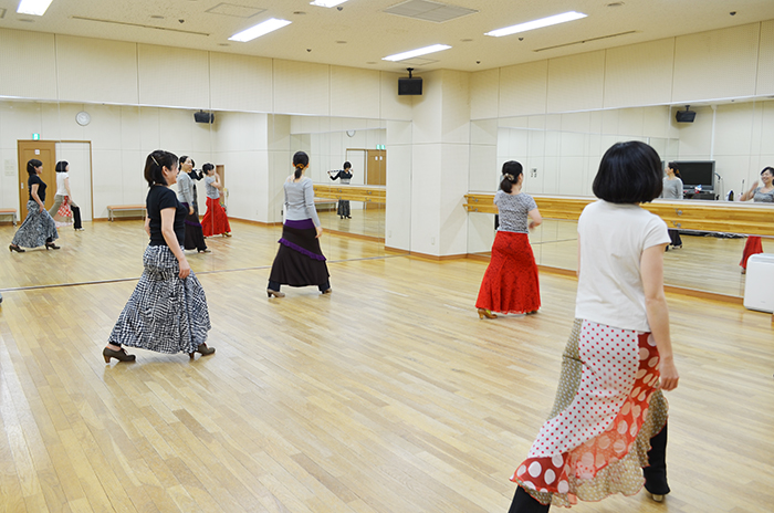 ストレッチから始め、手の動かし方やステップ、リズムの取り方などフラメンコの基礎から